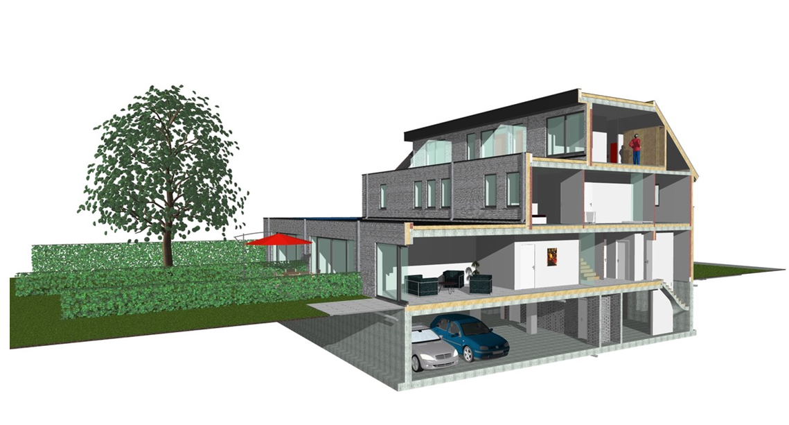Het luxe project Olmenzicht omvat 3 geschakelde woningen met per woning 2 ondergrondse parkeerplaatsen en een ondergrondse ruime privatieve berging. De volledige kelderverdieping is gemeenschappelijk.